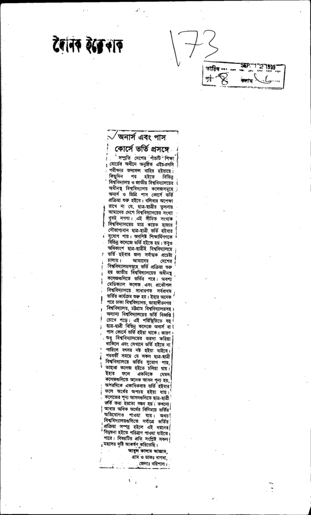 অনার্স এবং পাশকোর্সে ভর্তি প্রসঙ্গে Published on Newspaper দৈনিক ইত্তেফাক Category Personal Opinion / Discussion / Commentary Personal Speech / Discussion / Comentary Secondary and Higher Secondary Education Download