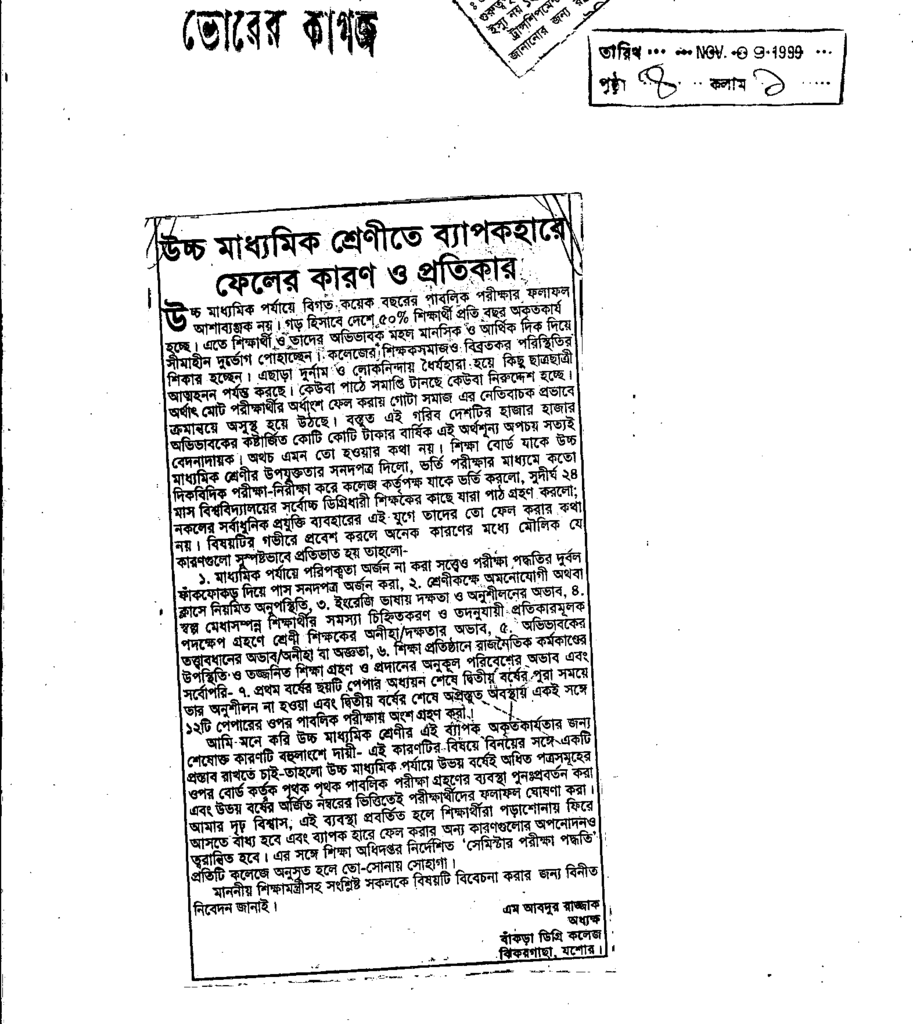 উচ্চমাধ্যমিক শ্রেণীতে ব্যাপকহারে ফেলের কারণ ও প্রতিকার Published on Newspaper দৈনিক ভোরের কাগজ Category Personal Opinion / Discussion / Commentary Personal Speech / Discussion / Comentary Secondary and Higher Secondary Education Download