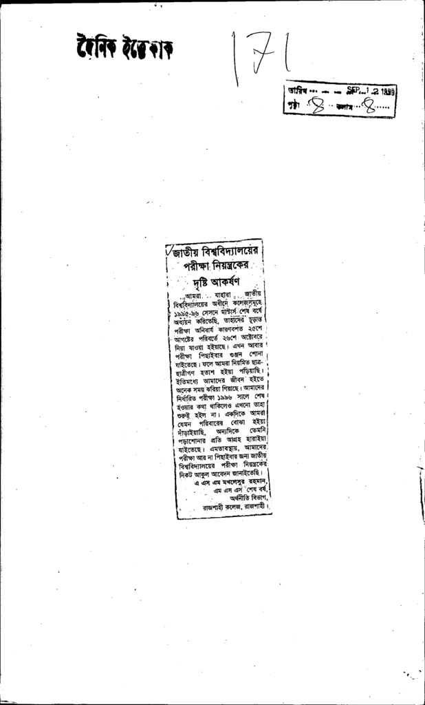 জাতীয় বিশ্ববিদ্যালয়েরর পরীক্ষা নিয়ন্ত্রকের দৃষ্টি আকর্ষণ Published on Newspaper দৈনিক ইত্তেফাক Category Personal Opinion / Discussion / Commentary Personal Speech / Discussion / Comentary Secondary and Higher Secondary Education Download