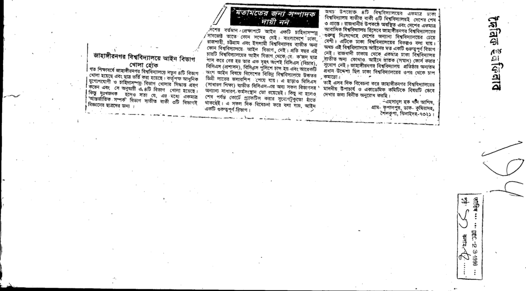 জাহাঙ্গীরনগর বিশ্ববিদ্যালয়ে আইন বিভাগ খোলা হোক Published on Newspaper দৈনিক ইনকিলাব Category Personal Opinion / Discussion / Commentary Personal Speech / Discussion / Comentary Secondary and Higher Secondary Education Download