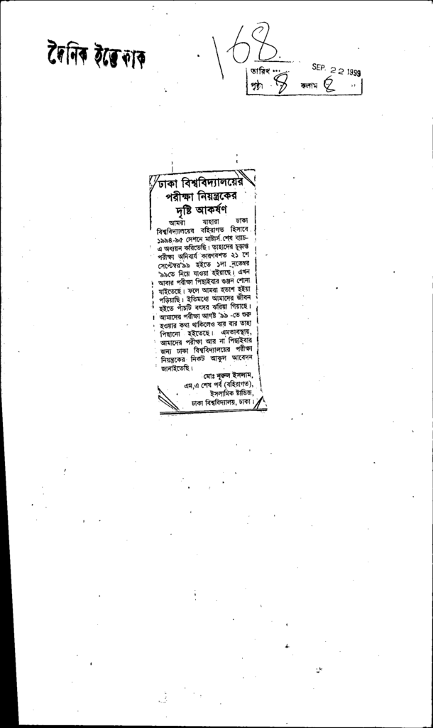 ঢাকা বিশ্ববিদ্যালয়ের পরীক্ষা নিয়ন্ত্রকের দৃষ্টি আকর্ষণ