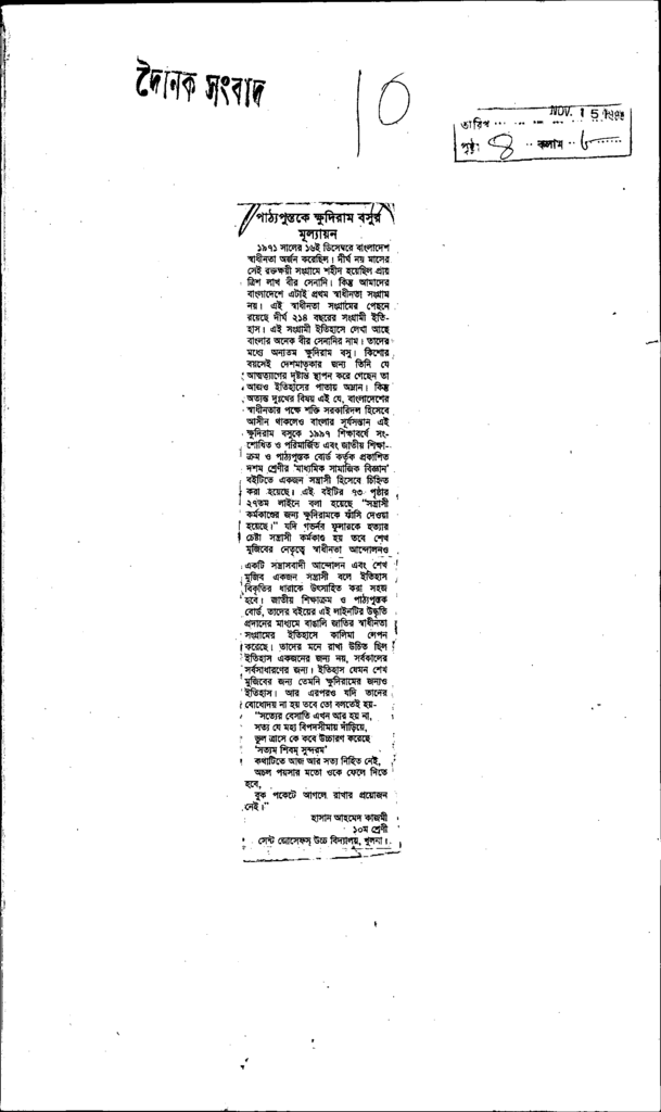 পাঠ্যপুস্তকে ক্ষুদিরাম বসুর মূল্যায়ন