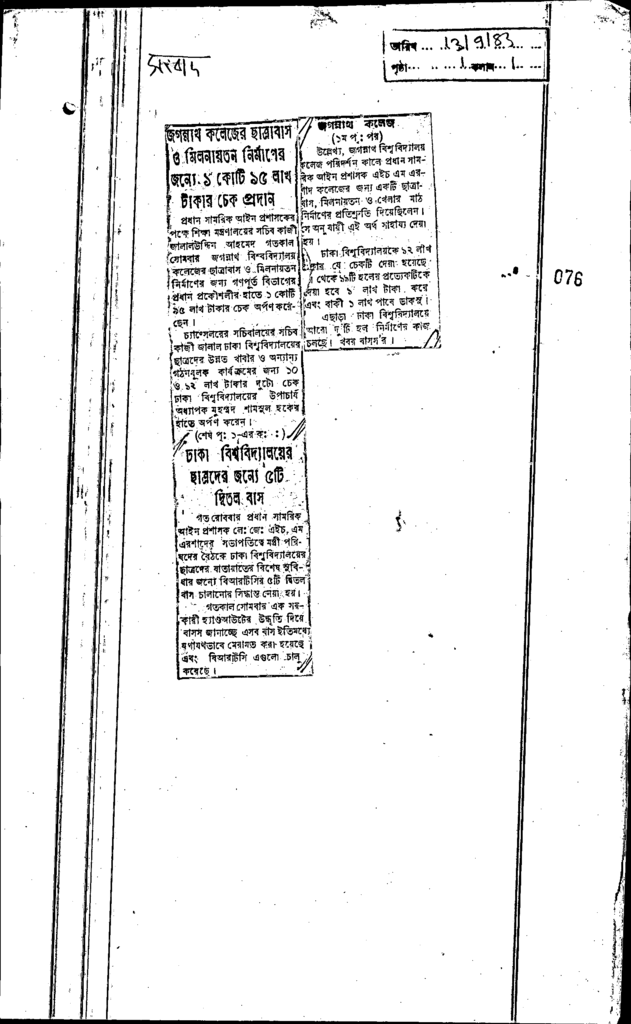 জগন্নাথ কলেজের ছাত্রাবাস ও মিলনায়তন নির্মাণের জন্যে ১ কোটি ৯৫লাখ টাকার চেক প্রদান Published on Newspaper দৈনিক সংবাদ Category Admission / Seat Problem Download