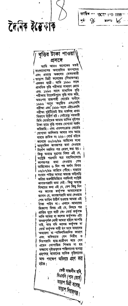 বৃত্তির টাকা পাওয়া প্রসঙ্গে