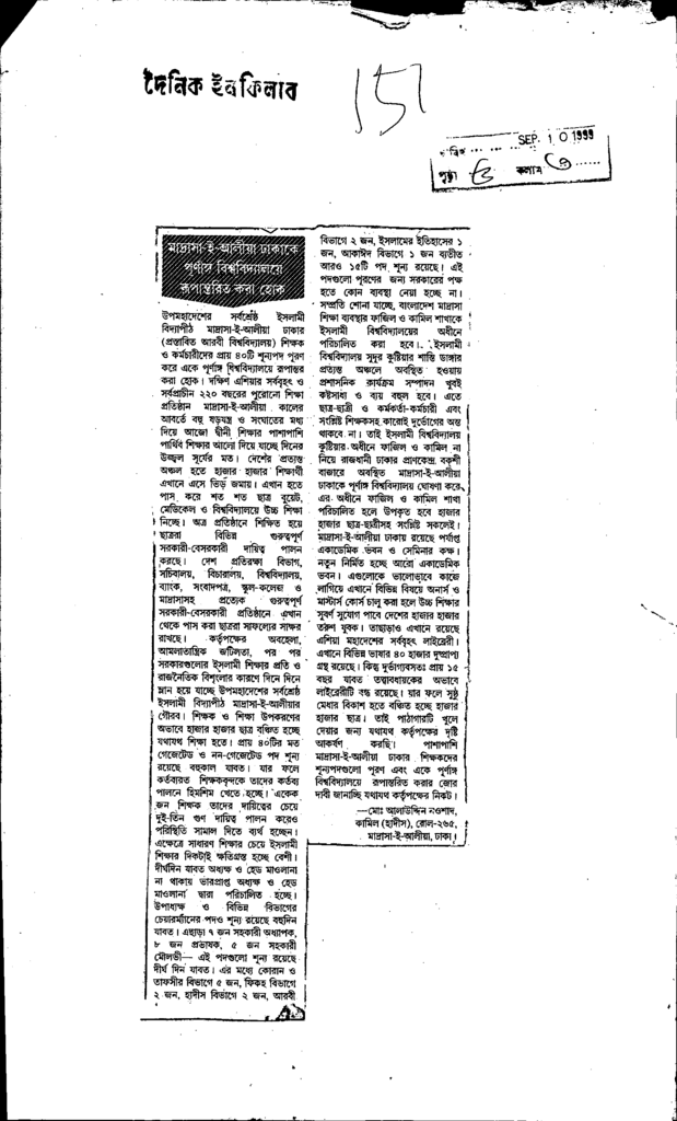 মাদ্রাসা-ই-আলীয়া ঢাকাকে পূর্ণাঙ্গ বিশ্ববিদ্যালয় করা হোক Published on Newspaper দৈনিক ইনকিলাব Category Personal Opinion / Discussion / Commentary Personal Speech / Discussion / Comentary Secondary and Higher Secondary Education Download