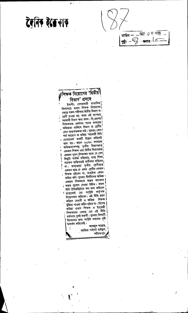 শিক্ষক নিয়োগের দ্বিতীয় বিভাগ প্রসঙ্গে Published on Newspaper দৈনিক ইত্তেফাক Category Personal Opinion / Discussion / Commentary Personal Speech / Discussion / Comentary Secondary and Higher Secondary Education Download