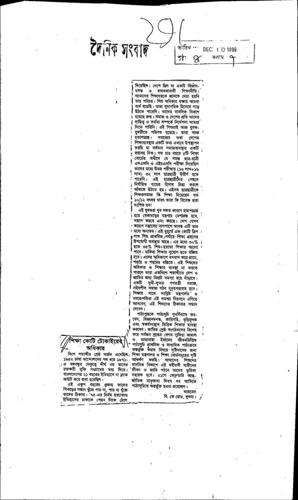 শিক্ষা কোটি টোকাইয়ের অধিকার Published on Newspaper দৈনিক সংবাদ Category Personal Opinion / Discussion / Commentary Personal Speech / Discussion / Comentary Secondary and Higher Secondary Education Download