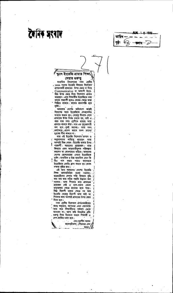 স্কুলে ইংরেজি গ্রামার শিক্ষা দেয়ার গুরুত্ব Published on Newspaper দৈনিক সংবাদ Category Personal Opinion / Discussion / Commentary Personal Speech / Discussion / Comentary Secondary and Higher Secondary Education Download
