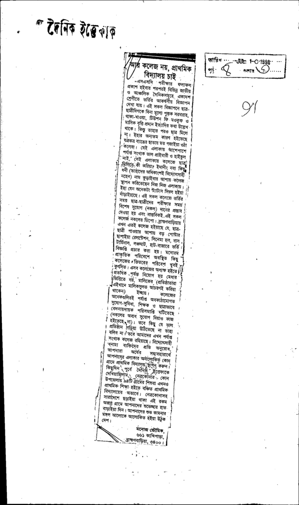 আর কলেজ নয়,প্রাথমিক বিদ্যালয় চাই Published on Newspaper দৈনিক ইত্তেফাক Category Personal Opinion / Discussion / Commentary Personal Speech / Discussion / Comentary Secondary and Higher Secondary Education Download