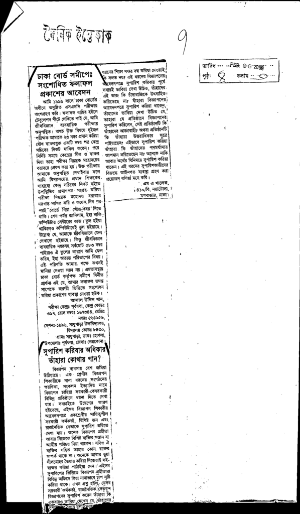 ঢাকা বোর্ড সমীপেঃ সংশোধিত ফলাফল প্রকাশের আবেদন