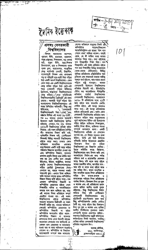 প্রসঙ্গঃ বেসরকারী বিশ্ববিদ্যালয় Published on Newspaper দৈনিক ইত্তেফাক Category Personal Opinion / Discussion / Commentary Personal Speech / Discussion / Comentary Secondary and Higher Secondary Education Download