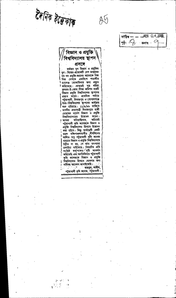 বিজ্ঞানও প্রযুক্তি বিশ্ববিদ্যালয় স্থাপন প্রসঙ্গে Published on Newspaper দৈনিক ইত্তেফাক Category Personal Opinion / Discussion / Commentary Personal Speech / Discussion / Comentary Secondary and Higher Secondary Education Download