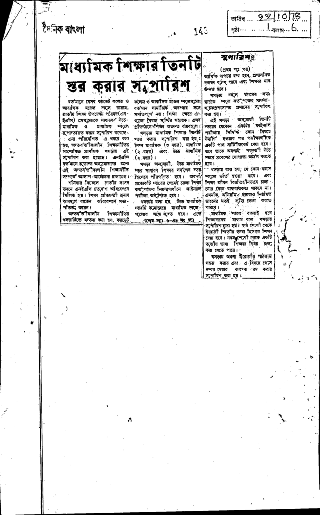 মাধ্যমিক শিক্ষার তিনটি স্তর করার সুপারিশ Published on Newspaper দৈনিক বাংলা Category General Education Download