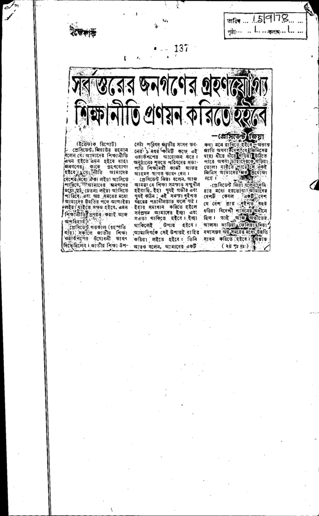 সর্বস্তরের জনগনের গ্রহণডযোগ্য শিক্ষানীতি প্রণয়ন করিতে হইবেঃ প্রেসিডেন্ট জিয়া Published on Newspaper দৈনিক ইত্তেফাক Category General Education Download