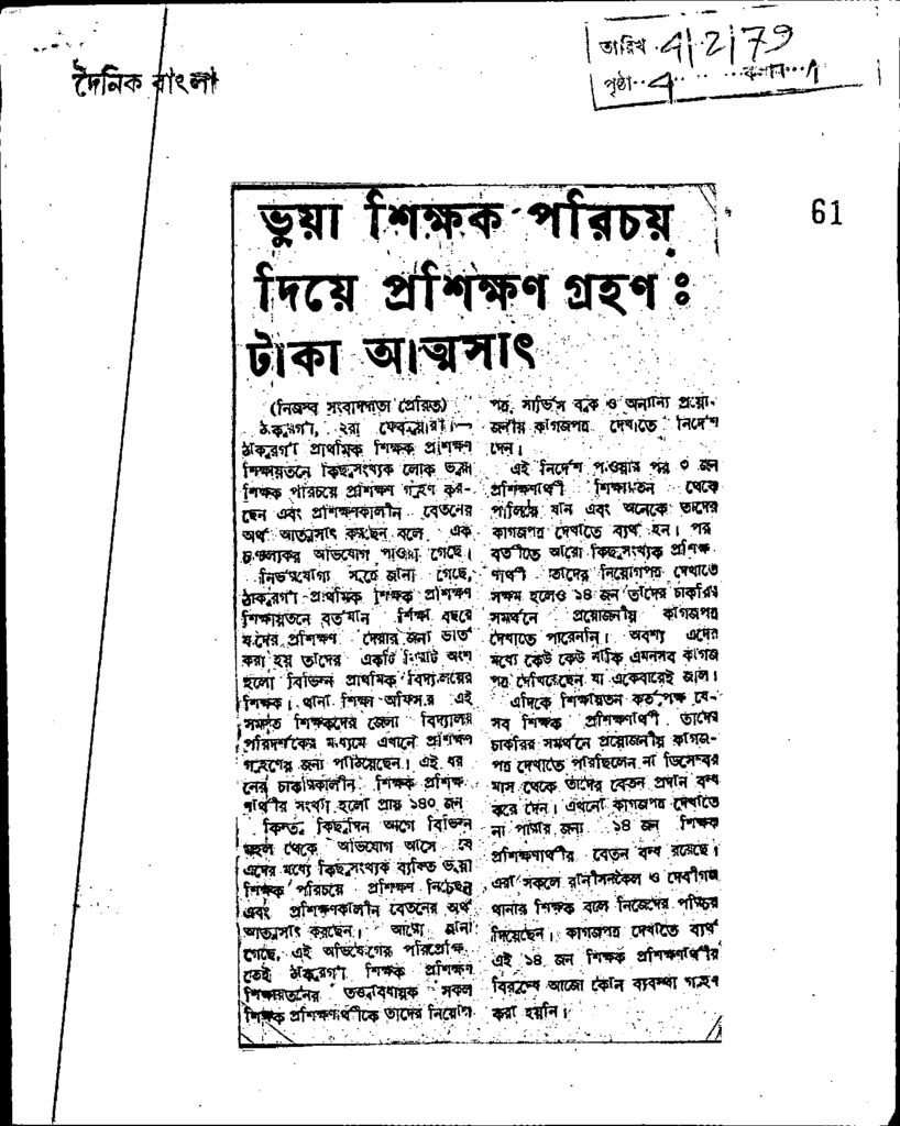 ভুয়া শিক্ষক পরিচয় দিয়ে প্রশিক্ষণ গ্রহণ : টাকা আত্মসাৎ Published on Newspaper দৈনিক বাংলা Category General Education Download