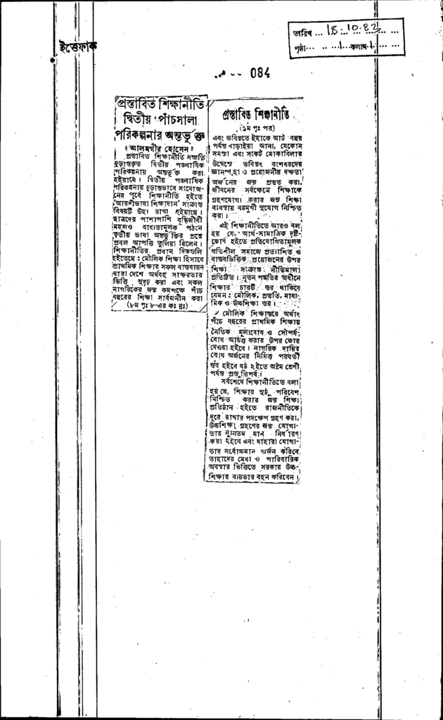 প্রস্তাবিত শিক্ষানীতি দ্বিতীয় পাঁচসালা পরিকল্পনার অন্তর্ভুক্ত Published on Newspaper দৈনিক ইত্তেফাক Category Admission / Seat Problem Download