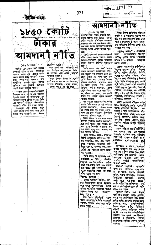 ১৮৫০ কোটি টাকার আমদানী নীতি