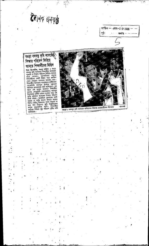 বগুড়া বঙ্গবন্ধু কৃষি কলেজের শিক্ষার পরিবেশ ফিরিয়ে আনতে শিক্ষার্থীদের মিছিল Published on Newspaper দৈনিক জনকণ্ঠ Category Professional Education Professional Education Others Download