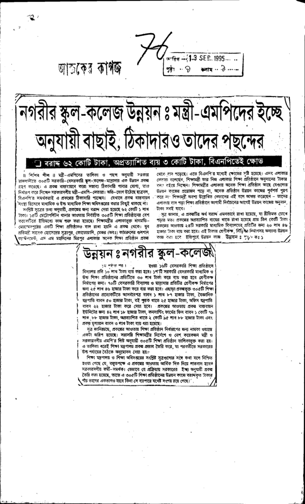 নগরীর স্কুল - কলেজ উন্নয়নঃ মন্ত্রী - এমপিদের ইচ্ছে অনুযায়ী বাছাই,ঠিকাদার ও তাদের পছন্দের Published on Newspaper দৈনিক আজকের কাগজ Category General Education General Education Download