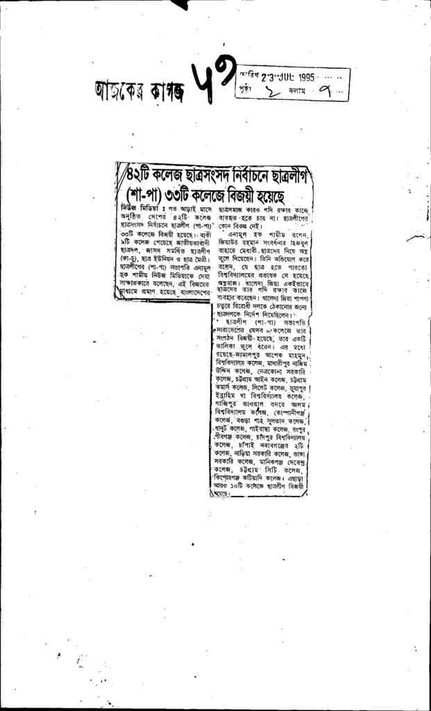 ৪২টি কলেজে ছাত্রসংসদ নির্বাচনে ছাত্রলীগ (শা-পা)৩৩টি কলেজে বিজয়ী হয়েছে Published on Newspaper দৈনিক আজকের কাগজ Category General Education General Education Download
