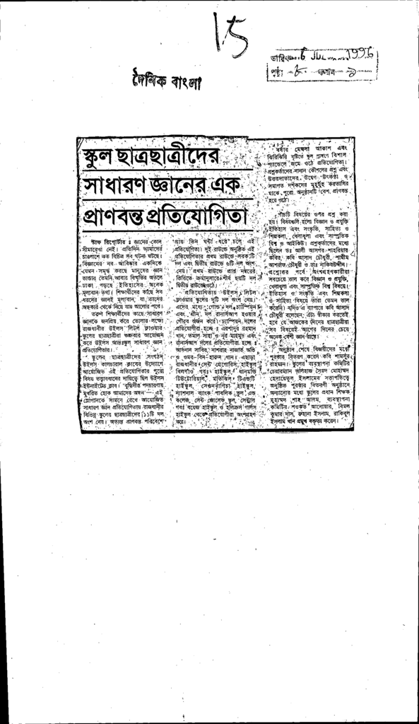 স্কুল ছাত্রছাত্রীদের সাধারণ জ্ঞানের এক প্রাণবন্ত প্রতিযোগিতা Published on Newspaper দৈনিক বাংলা Category General Education General Education Download