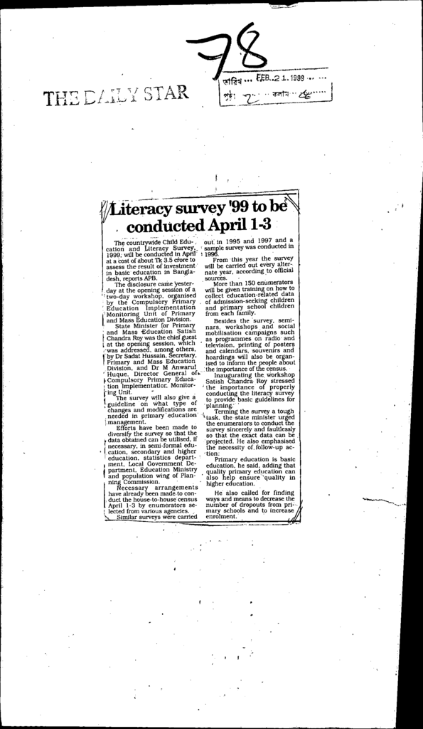 Literacy survey 99 to be conducted april 1-3 Published on Newspaper The Daily Star Category Educational Ministry / Departments Education Ministry / Division / Directorate Download