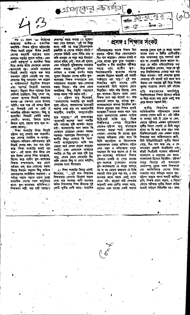 প্রসঙ্গঃ শিক্ষার সংকট Published on Newspaper দৈনিক আজকের কাগজ Category Personal Opinion / Discussion / Commentary Download