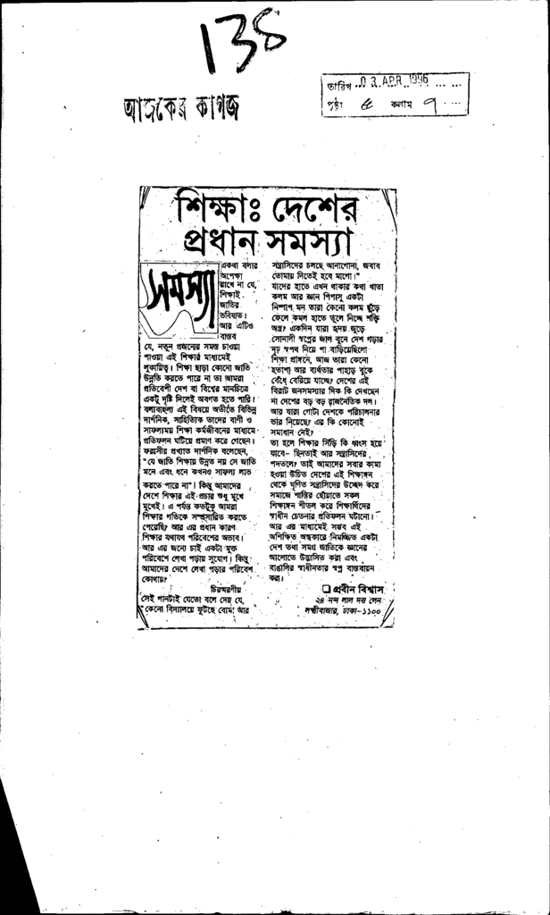 শিক্ষাঃ দেশের প্রধানঃ সমস্যা Published on Newspaper দৈনিক আজকের কাগজ Category Personal Opinion / Discussion / Commentary Download