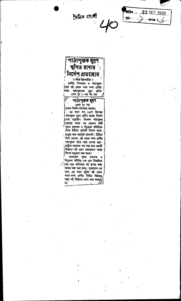 পাঠ্যপুস্তক মুদ্রণ স্থগিত রাখার নির্দেশ প্রত্যাহার Published on Newspaper দৈনিক বাংলা Category Educational Ministry / Departments Education Board NCTB Education Ministry / Division / Directorate Download