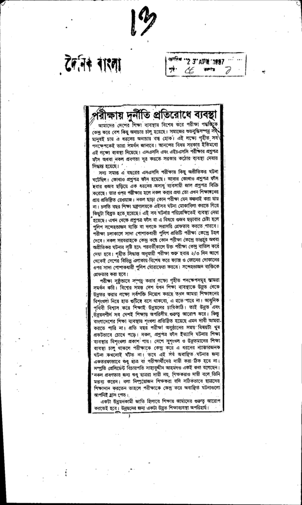 পরীক্ষায় দুর্নীতি প্রতিরোধে ব্যবস্থা Published on Newspaper দৈনিক বাংলা Category Public Examination Public Examination SSC Download