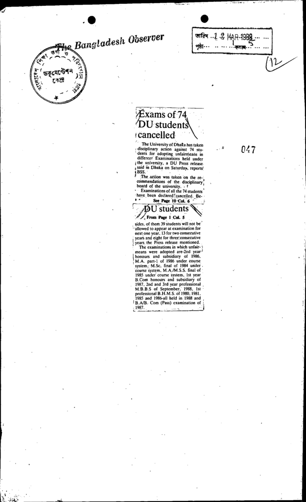 Exams of 74 du students cancelled Published on Newspaper The Bangladesh Observer Category Public Examination Public Examination Higher Education Download