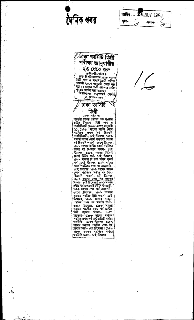 ঢাকা ভার্সিটি ডিগ্রি পরীক্ষা জানুয়ারীর ২৩ থেকে শুরু Published on Newspaper দৈনিক খবর Category Public Examination Public Examination Higher Education Download