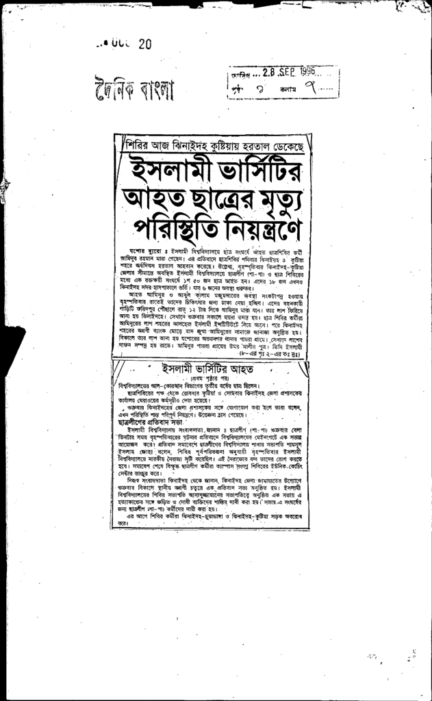 ইসলামী ভার্সিটির আহত ছাত্রের মৃত্যু পরিস্থিতি নিয়ন্ত্রণে Published on Newspaper দৈনিক বাংলা Category General Education Download