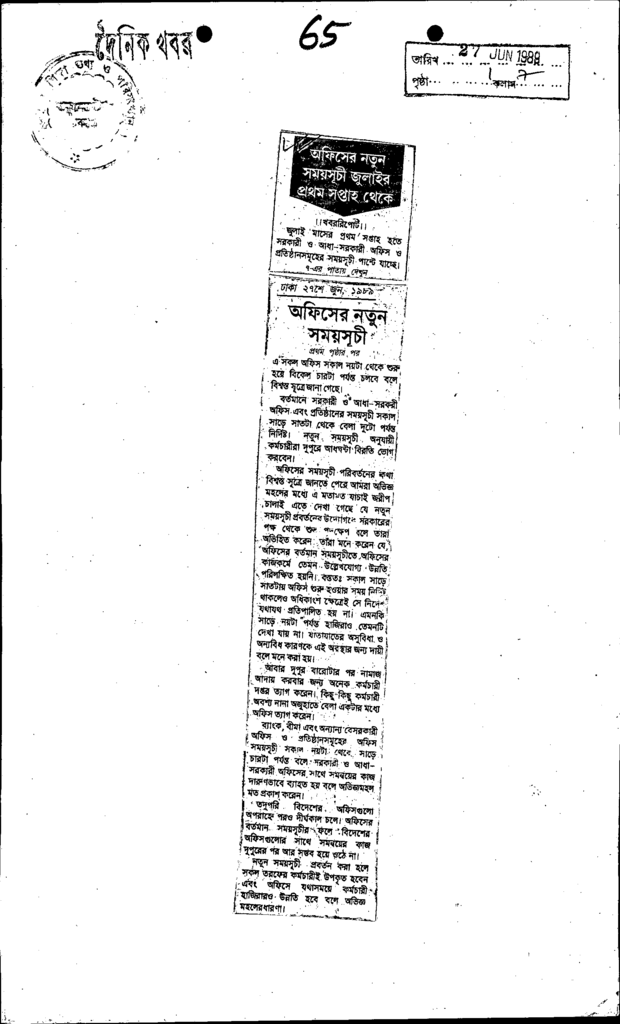 অফিসের নতুন সময়সূচী জুলাইয়ের প্রথম সপ্তাহ থেকে Published on Newspaper দৈনিক খবর Category General Education Download