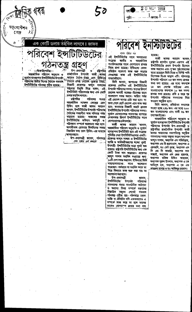 পরিবেশ ইন্সটিটিউটের গঠনতন্ত্র গ্রহণ Published on Newspaper দৈনিক খবর Category General Education Download