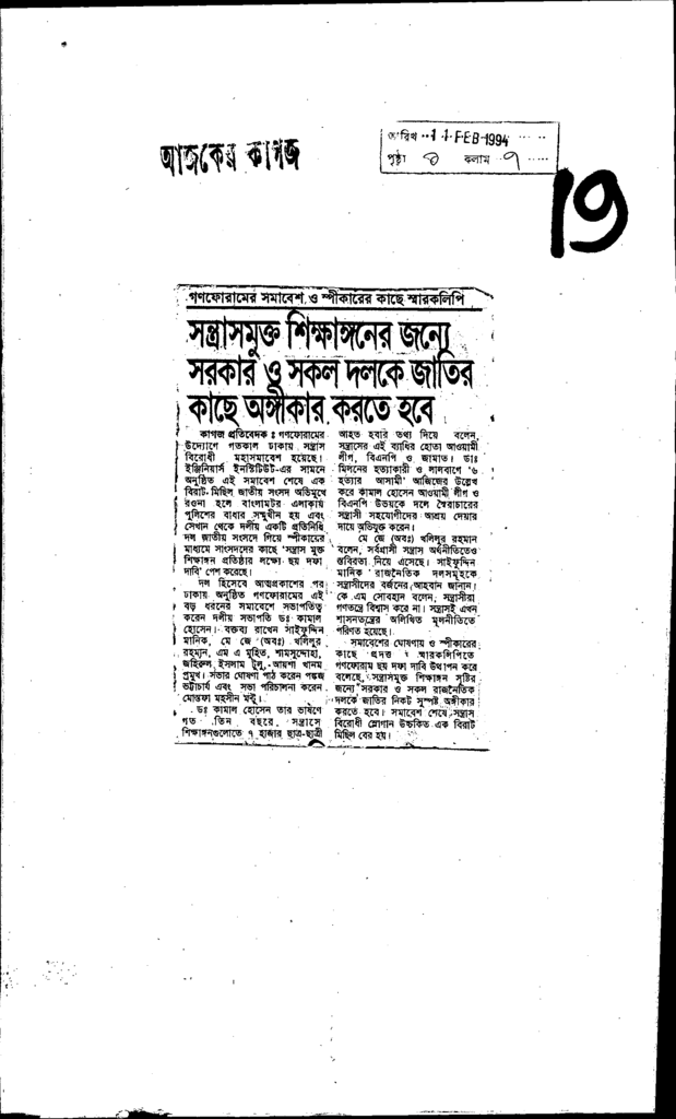 সন্ত্রাসমুক্ত শিক্ষাঙ্গনের জন্য সরকার ও সকল দলকে জাতির কাছে অঙ্গীকার করতে হবে Published on Newspaper দৈনিক আজকের কাগজ Category General Education Download