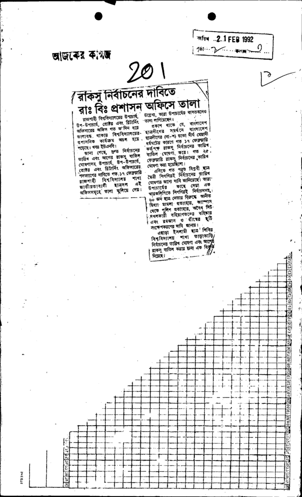 রাকসু নির্বাচনের দাবিতে রাঃবিঃ প্রশাসন অফিসে তালা Published on Newspaper দৈনিক আজকের কাগজ Category Student Politics Download