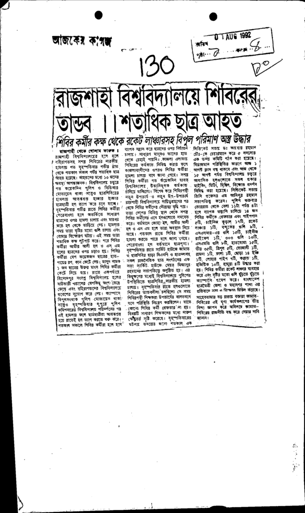 রাজশাহী বিশ্ববিদ্যালয়ে শিবিরে তান্ডব।। শতাধিক ছাত্র আহত Published on Newspaper দৈনিক আজকের কাগজ Category Student Politics Download