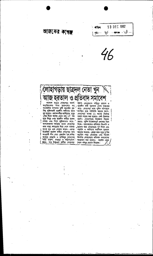 লোহাগড়ায় ছাত্রদল নেতা খুন আজ হরতাল ও প্রতিবাদ সমাবেশ Published on Newspaper দৈনিক আজকের কাগজ Category Student Politics Download