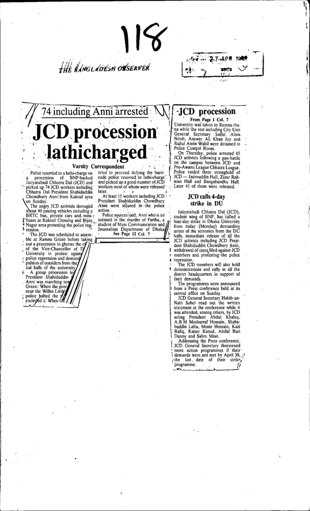 74including a/nni arrested jcd procession lathicharged Published on Newspaper The Bangladesh Observer Category Student Politics Download