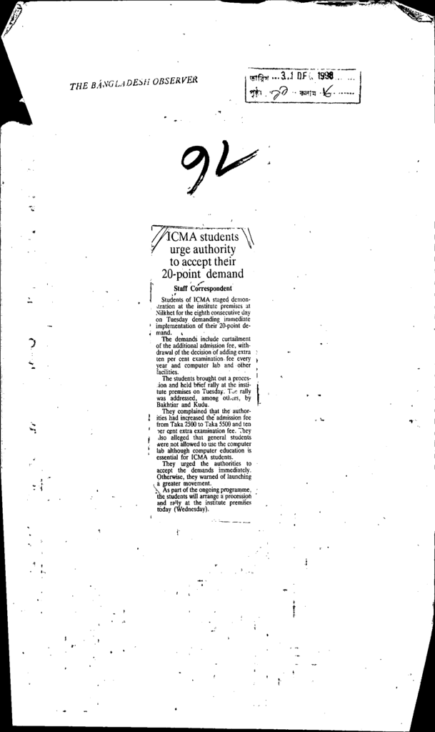 Icma students urge authority to accept their 20 point demand Published on Newspaper The Bangladesh Observer Category Student Politics Download
