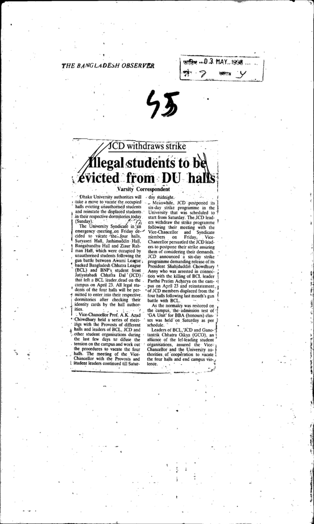 Jcd withdraws strike lllegal students to be evicted from du halls Published on Newspaper The Bangladesh Observer Category Student Politics Download