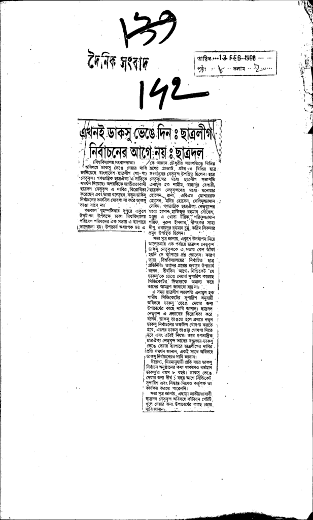 এখনই ডাকসু ভেঙে দিন: ছাত্রলীগে নির্বাচনের আগে নয়। ছাত্রদল Published on Newspaper দৈনিক সংবাদ Category Student Politics Download