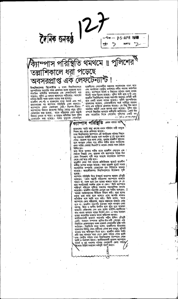 ক্যাম্পাস পরিসিহতি থম থমে । । পুলিশের তল্লাশিকার ধরা পড়েছে অবসরপ্রাপ্ত এক লেফটেন্যান্ট। Published on Newspaper দৈনিক জনকণ্ঠ Category Student Politics Download