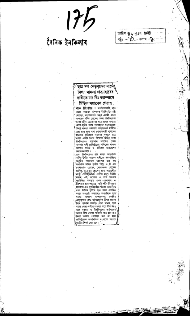ছাত্র দল নেতৃবৃ্েদর নামে মিথ্যা মামলা প্রত্যাহারের দাবীতে ঢা: বি: ক্যাম্পাসে মিছিল বসমাভেকম ঘেরাও