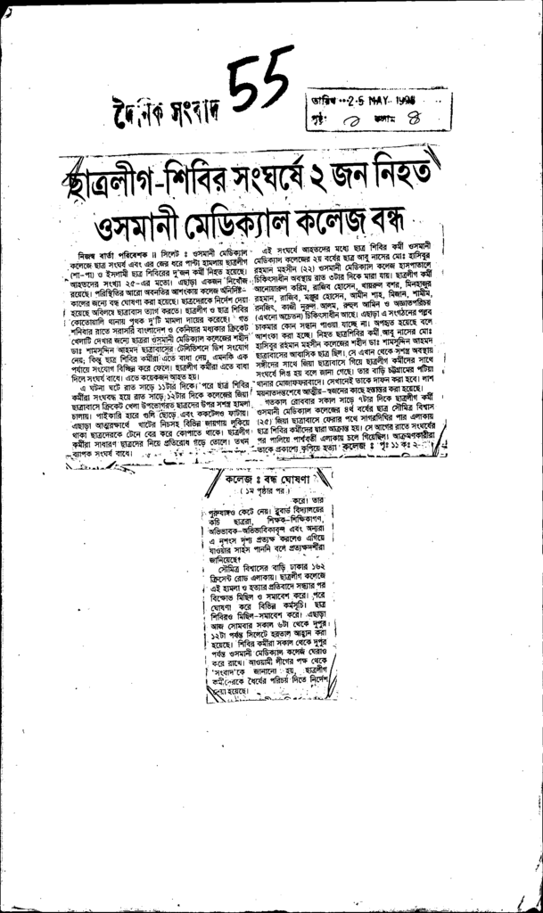 ছাত্রলীগ শিবির সংঘর্ষে ২জন নিহত ওসমানী মেডি৩ক্রাল করৈজ বন্ধ Published on Newspaper দৈনিক সংবাদ Category Student Politics Download
