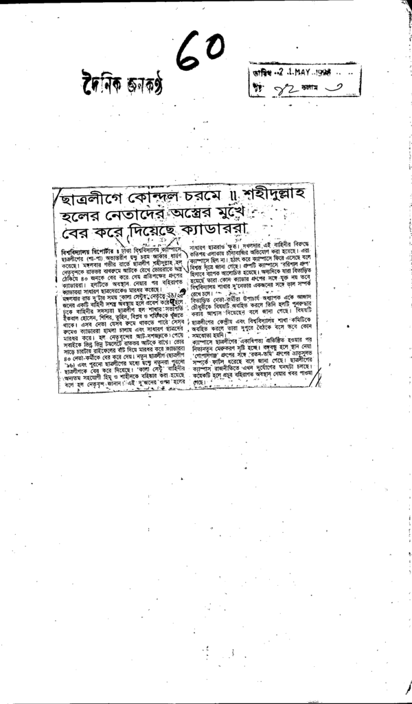 ছাত্রলীগে কোন্দল চরমে । । শহীদুল্লাহ হলের নেতাদের অস্ত্রের মুখে বের করে দিয়েছে ক্যাডাররা Published on Newspaper দৈনিক জনকণ্ঠ Category Student Politics Download