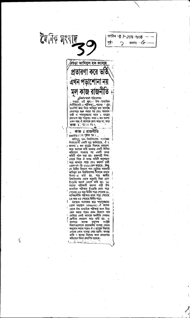 বগুড়া আযিযুল হক কলেজ প্রতারণা করে ভর্তি এখন পড়াশোনা নয় মূল কাজ রপাজনীতি Published on Newspaper দৈনিক সংবাদ Category Student Politics Download