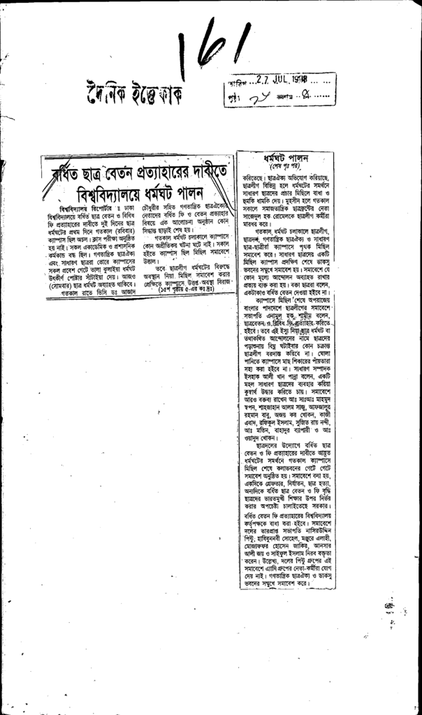 বর্ধিত ছাত্র বেতন প্রত্যাহারের দাবীতে বিশ্ববিদ্যালয়ে Published on Newspaper দৈনিক ইত্তেফাক Category Student Politics Download