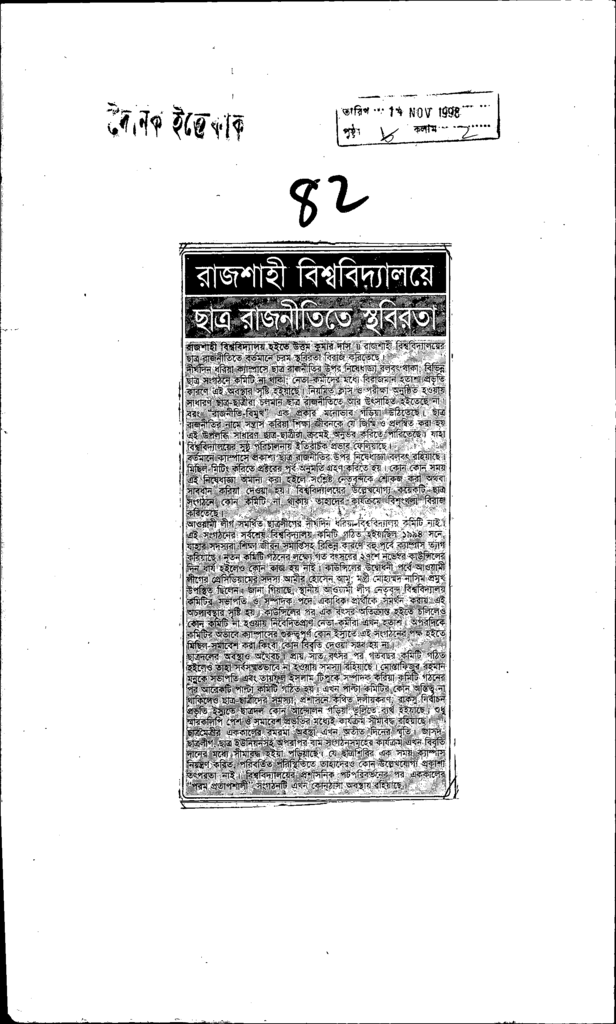 রাজশাহী বিশ্ববিদ্যালয়ে ছাত্র রাজনতিতে স্হবিরতা Published on Newspaper দৈনিক ইত্তেফাক Category Student Politics Download